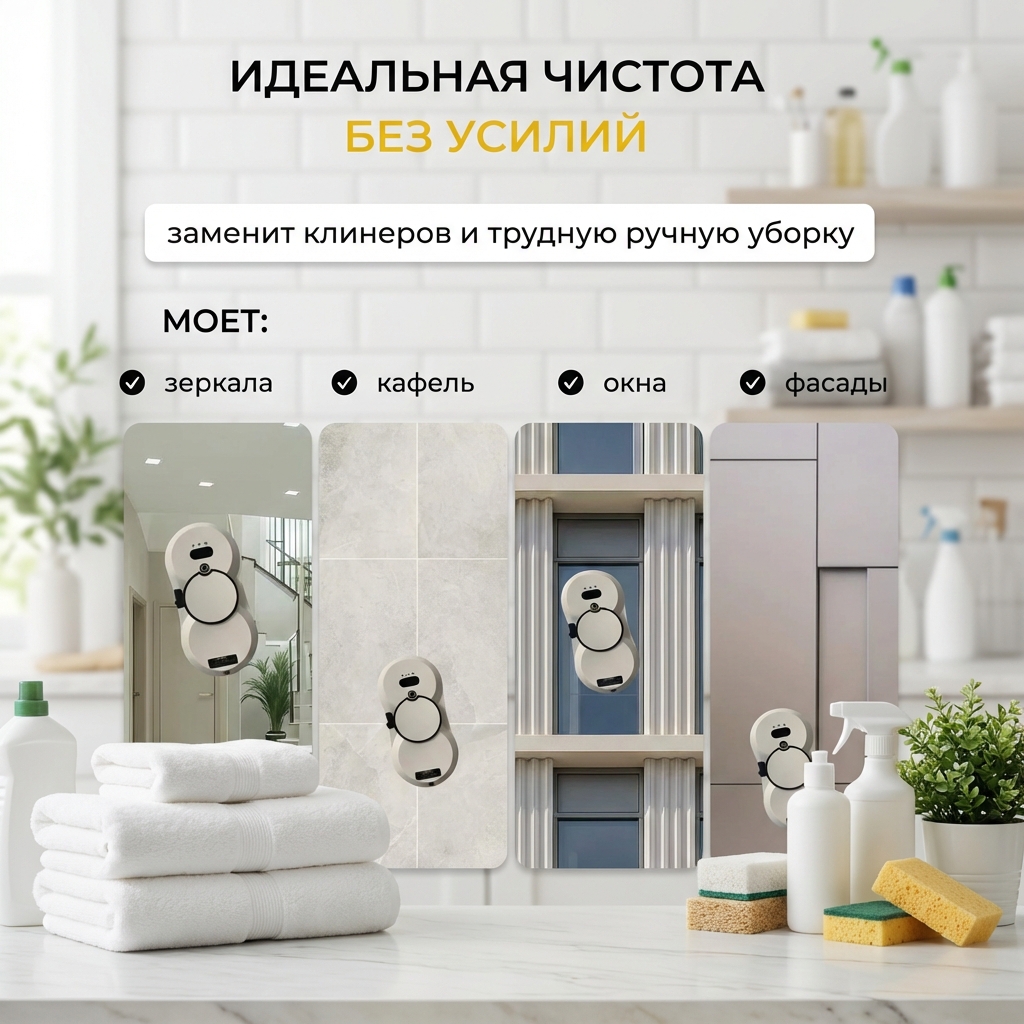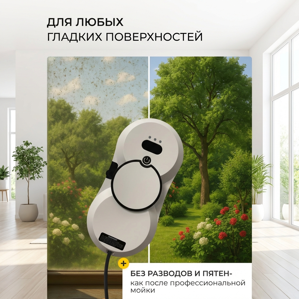 Представляем вам современного помощника для дома — робот-мойщик окон. Забудьте о ручном труде, опасных танцах на табуретках и разводах на стеклах. Этот умный гаджет создан для безупречной очистки не только окон, но и зеркал, кафельной плитки, балконных и панорамных стекол, включая глухие окна и поверхности с решетками на высоких этажах.